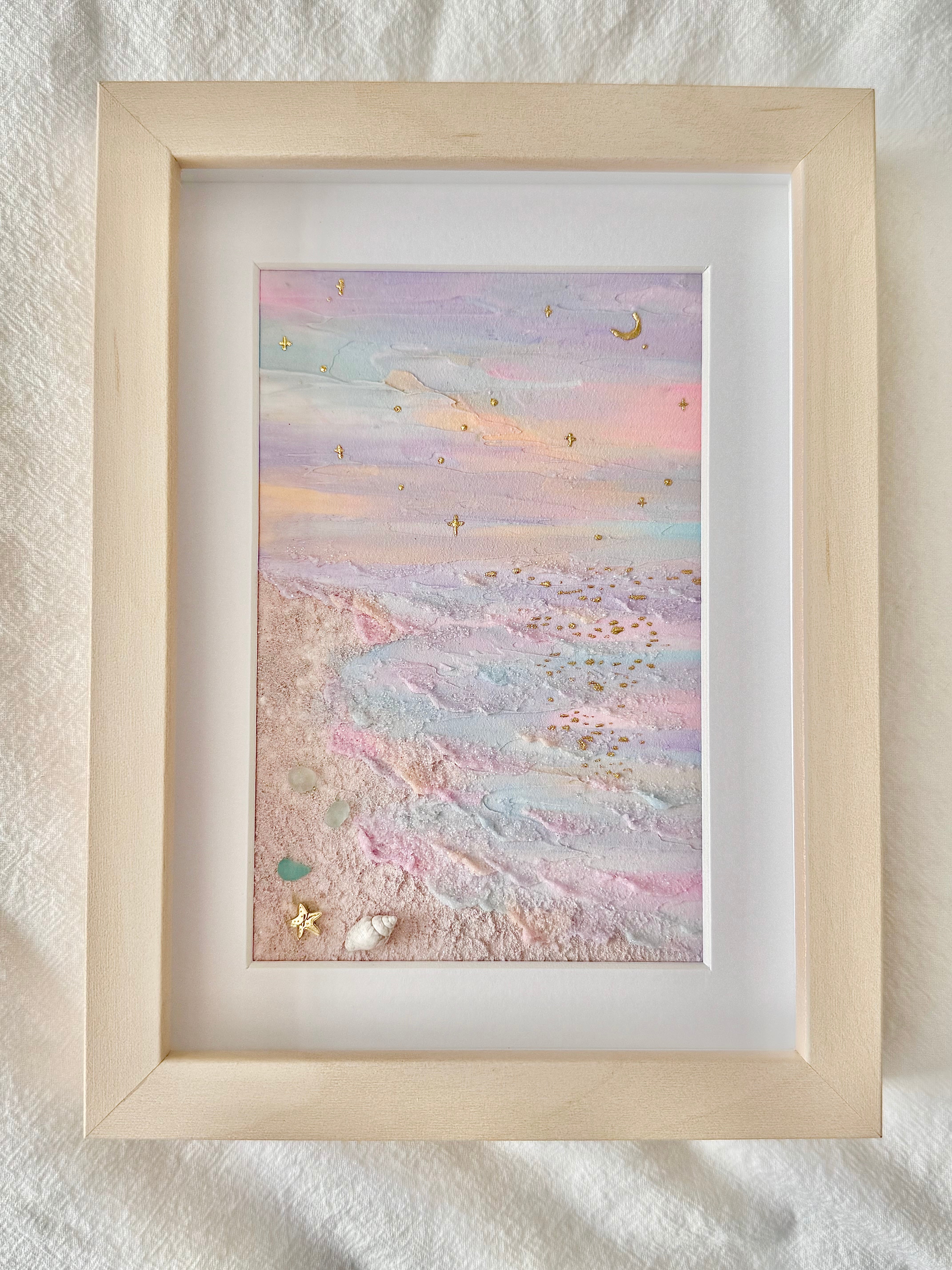 灯る月と星が輝く海を描きました。