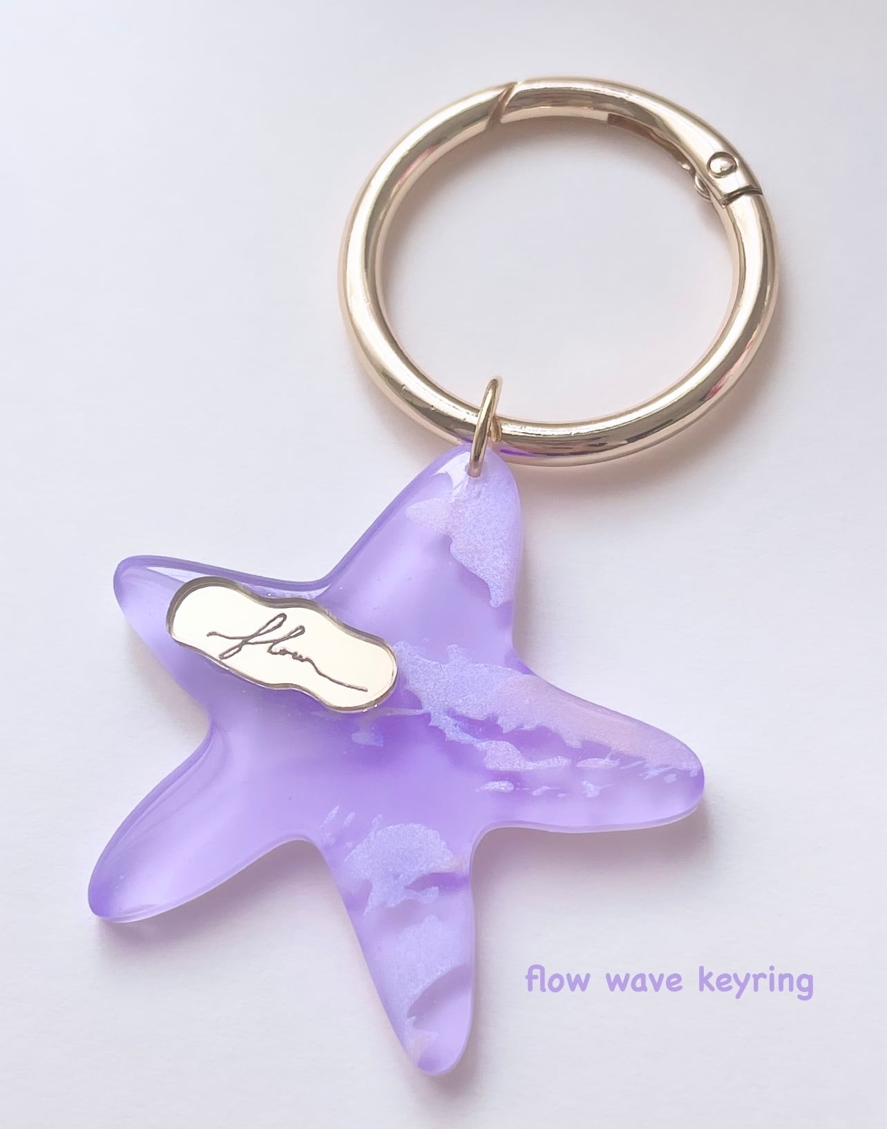ヒトデのモチーフがかわいらしい、スターウェーブキーリングです。裏面にはピンクとブルーの波を描いてますさらに動かすと色が変わり、ガラスのラメを散らし個性的なアクセントが加わっています。バッグやキーケースなどにつける小さなサイズなので、持ち物の邪魔にならないスタイリッシュで可愛らしいキーリングをお楽しみください。
