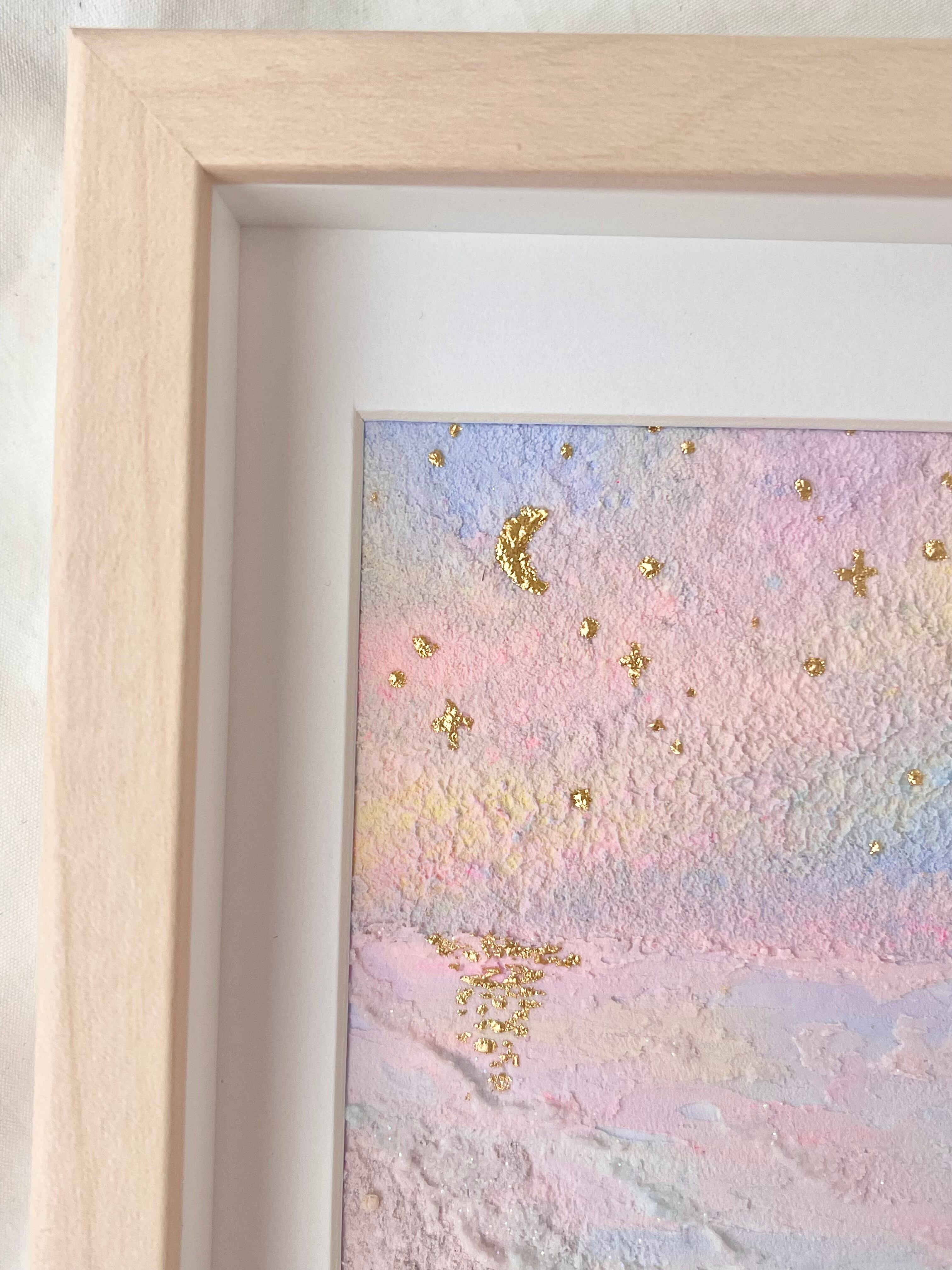 夕方の空にうっすら煌めく月と星は純金箔(24k)を使用して描いてます。