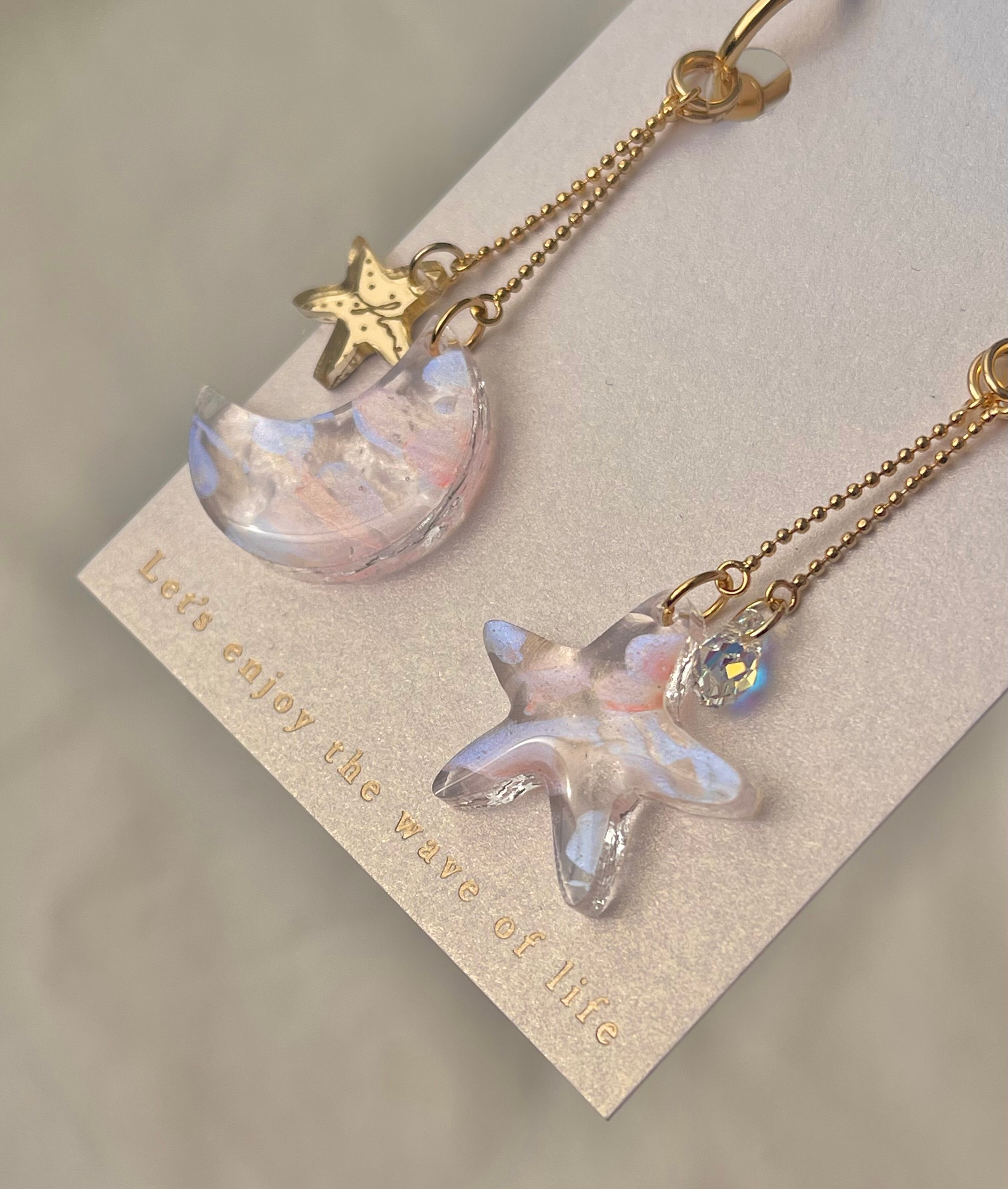 シンプルながらも華やかさを感じるデザインで、普段使いや特別な日のアクセントにぴったりです。さりげなく輝く星や月が、キラキラ色を変えて華やかになります自分へのご褒美や、大切な人への贈り物にもおすすめです。