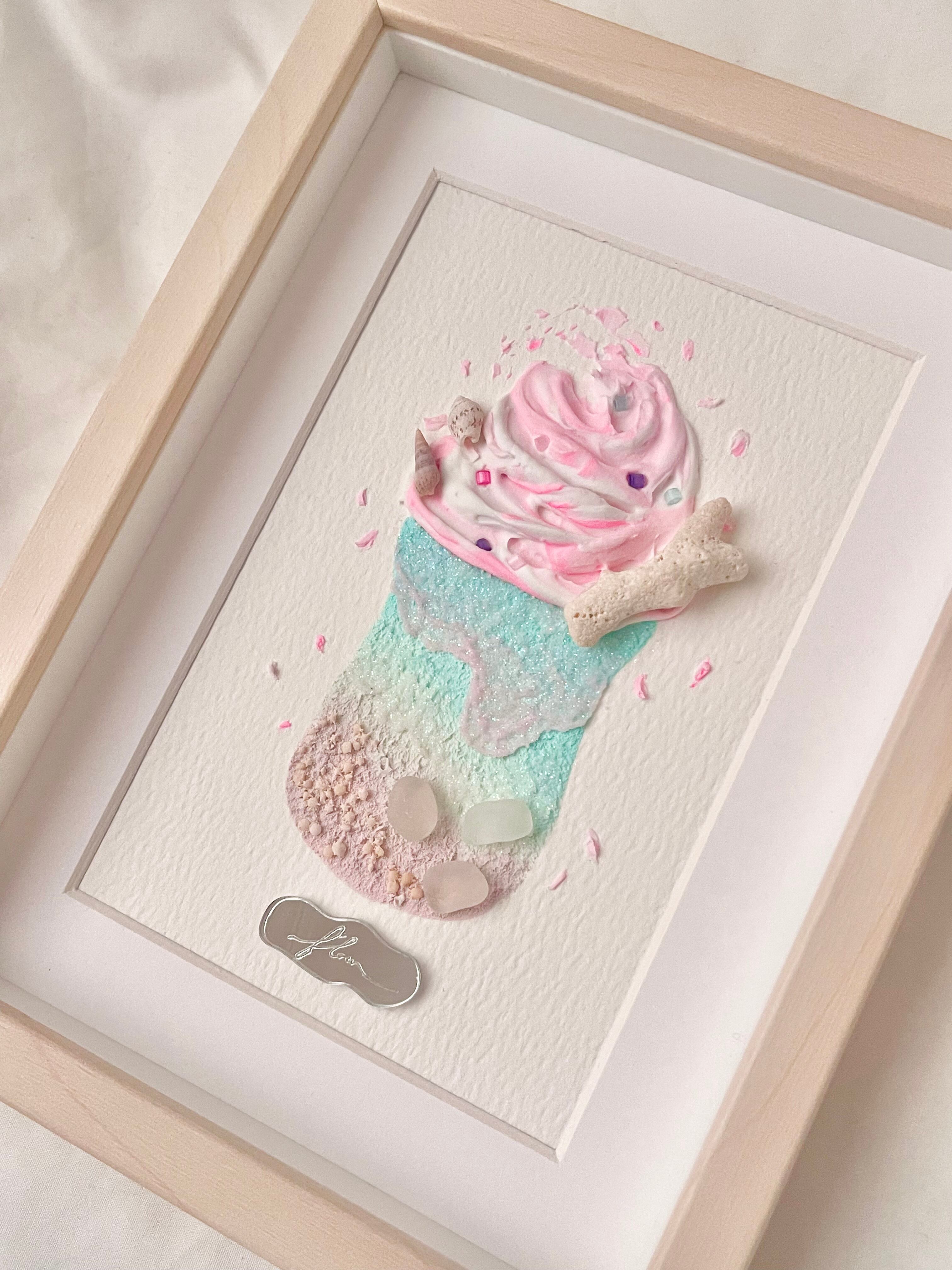 桜のほんのりとした甘さとバニラの香りと夏にぴったりの爽やかな味わいを感じそうなアートです。